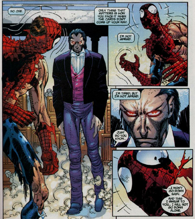Before their first proper encounter, Ezekial warns Peter that all his foes are “only echoes of something far darker… and infinitely more lethal.” When Spider-Man encounters him for the first time, he repeats how grave and serious the threat is. “And for the first time, I don’t have a wisecrack right at hand. Because nothing’s funny anymore.” Given everything the world has ever thrown at the character, it seems a little ridiculous that Spidey is struck silent even before he makes proper contact with Morlun.