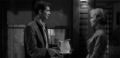 (It’s also interesting to note how Hitchcock links food and sex. He seems to suggest that both are pretty basic human urges and should be satisfied in a healthy manner. Marion Crane visits with her lover on her lunch hour – the sordid nature of their affair perhaps referenced by the fact that she hasn’t touched her food. “You never did eat your lunch,” he chides. Her desire for a more regular intimate relationship is expressed in terms of regular meals. “We could see each other… we could even have dinner,” she offers. His response makes the implicit sexual subtext explicit, “And after the steak, do we send Sister to the movies? Turn mama’s picture to the wall?”