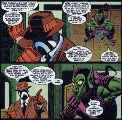 So Busiek uses Untold Tales of Spider-Man to explore Norman Osborn’s background and to suggest that he had been conspiring against Spider-Man for quite some time. We see him loan out his equipment to the new character of the Headsman, recruit the Crime-Master and attempt to recruit the Scarecrow. He even hires the Enforcers, and only considers adopting his own secret identity when his plans don’t quite pan out.