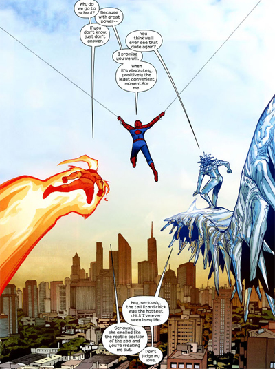 Part of what I really admire about Bendis’ Ultimate Spider-Man is the way that the status quo seems to be entirely flexible. There are only a handful of books publishing in the Ultimate line, and so Bendis isn’t too rigidly tied to a shared continuity. He can shake things up without impacting dozens of other titles and creative teams. Here, for example, he coopts the character of Johnny Storm from the defunct Ultimate Fantastic Four and Bobby Drake from the cancelled Ultimate X-Men, drawing them into his large and expansive supporting cast. He’s able to transition the Daily Bugle entirely from printed media to an on-line journal, and he can even allow J. Jonah Jameson to deduce Peter Parker’s secret identity.