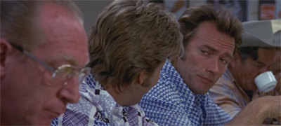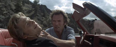 Of course, there is a very clear homoerotic subtext to this movie, as there are with so many “buddy” movies. Cimino’s Thunderbolt & Lightfootdoesn’t try to mask that – there’s no attempt to convince the movie that the two leads are just professionals doing a job, or any such thing. From the moment that fate seems to throw them together, with Thunderbolt dangling out of Lightfoot’s car, it seems like the pair are destined to be together. (Fittingly, despite all the people they encounter on their trip, the movie ends with the two of them alone.)