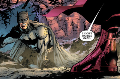 He also makes some sound, but incorrect, observations about Superman. “Where do you hide?” Bruce wonders. “You don’t wear a mask so apparently you have no identity to protect.” That’s an interesting and telling remark. That’s part of the reason I suspect that Lex Luthor has never come after Clark Kent or devoted any serious effort to discover Superman’s civilian identity – because it never occurs to Luthor in all his arrogance that Clark has a secret identity. It also opens up, rather subtly, that whole “is it really Superman or Clark Kent or Kal-El” debate.