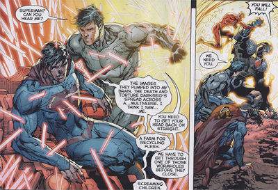 It does evoke the X-Men just a little bit, with the implication being that mankind is wary of what they suspect might be their replacements. In fact, it’s the opposite side of the coin that Morrison suggested. While Morrison’s Justice League ended with everybody on the planet given superpowers in order to fulfill their potential, with superheroes just the logical expression of mankind’s capacity for greatness, Johns suggests that the heroes remind people of their shortcomings rather than inspiring them to greatness.