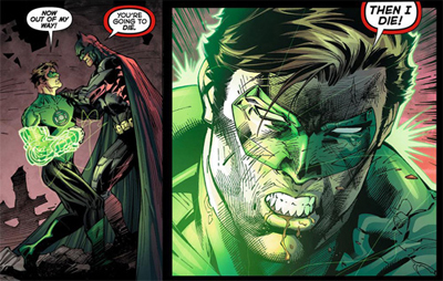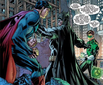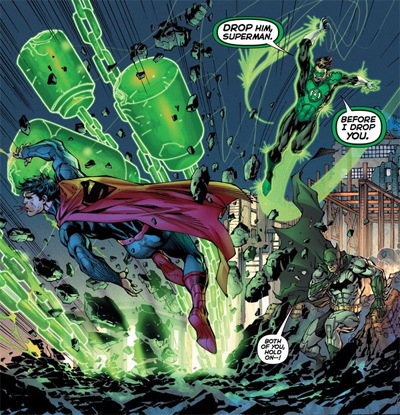 Hal Jordan is probably the character on the roster that Johns has written most. Perhaps as a result of that, Hal is the character that Johns feels least afraid to portray as juvenile and immature. At this point in the book, Johns’ Green Lantern seems almost singularly unsuited to the role of hero. He seems to be cruising for a fight. He’s ready to fight Batman (even though Batman is smart enough not to engage him) and is over-confident and over-eager to take on Superman.