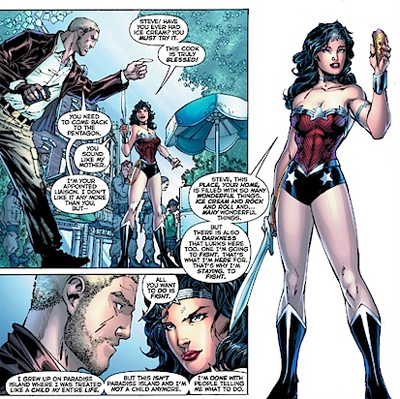 We also get elements of the “stranger in a strange world” portrayal as well, with Diana musing, “Ice cream is wonderful.” And Johns does give us a small conversation with a young girl that mirrors one of the stronger scenes in the superb animated Wonder Woman film, as Wonder Woman proves to be a strong feminine role model who doesn’t conform to gender archetypes. Although, sadly, Johns omits a scene where Wonder Woman teaches the girl how to fence better than her male friends.
