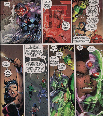 The problem is that there’s no development. There’s no sense that the characters are learning anything. All it takes is for Batman to suggest this to Hal, and Hal to suggest it to his teammates. There’s no learning curve, no member when Aquaman overcomes his arrogance or Wonder Woman comes to implicitly trust her teammates. On one page they are fighting as a bunch of individuals, and on the next page they are a perfectly-honed machine.