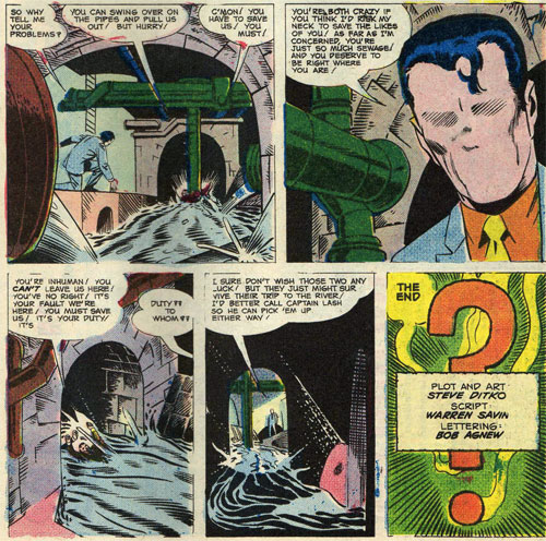 As such, the Question is an especially strange character. He was originally written by Steve Ditko as a mouthpiece for the writer’s objectivist philosophy, heavily influenced by the work of Ayn Rand. This was a character quite content to leave criminals to drown rather than helping them, like a more aggressive version of Batman. However, Ditko would go on to create an even more righteous vigilante in Mr. A, a character named for a tenant of objectivist philosophy cited here, but also serving to make Ditko’s two similarly-themed heroes a catchy “Q & A.”(Not that they ever appeared together, being from separate companies.)