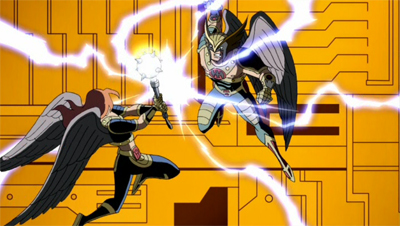 Still, Starcrossed hinges more on the emotional threat to the team, with the revelation that Hawkgirl had been serving as a spy for the past two years. Apparently the idea was suggested to Bruce Timm by DC editor Paul Levitz, and it’s a rather wonderful way of spicing up the interpersonal team dynamics. Hints had been gently seeded throughout the season, with Hawkgirl’s lack of curiousity about her home world in Twilight and her response to Doctor Fate in The Terror Beyond, and it feels like a logical pay-off to that particular plot thread.