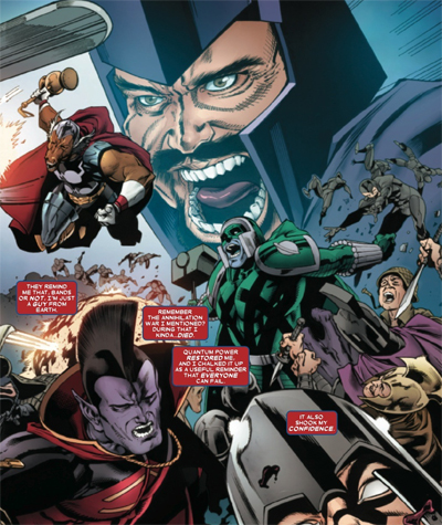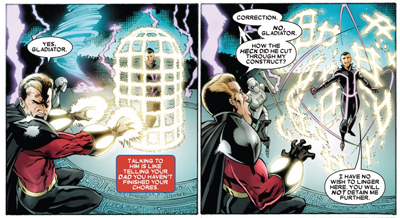 Abnett and Lanning rather cleverly suggest that these characters are barriers to themselves. After all, holding all that power, the impulse is going to be to hold back in order to avoid collateral damage. “Good close combat skills,” Ikon notes of Gladiator. “But too much restraint.” He responds, “I’m holding back because I don’t want to–“ It’s certainly a clever way of writing around the fact that these characters could essentially move planets if they wanted to.
