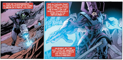 Throughout the miniseries, he is repeatedly referenced – never by name, but by “greatest leader” and “greatest warrior.” Without even mentioning his name, it’s clear that his presence is keenly missed. “How long has your husband been gone?” the Surfer asks Brandy. The Silver Surfer even suggests that Brandy would hope a crisis like this might prompt his return. It’s a smart and endearing way of writing around a legal problem, and I’ll confess that – despite never having read an issue of Rom: SpaceKnight– I couldn’t help but smile a bit reading it.