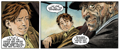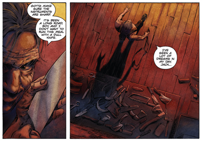 Scott Snyder and Scott Tuft’s Severed feels like a dark deconstruction of the American road myth, the type of story told by Mark Twain. Jack dreams of travelling the country, reconnecting with his long-lost father and even developing into a music star. When he arrives in Chicago, the big city, he discovers that it’s really nothing more than an anonymous meat grinder. When he can’t find his father performing at a high-profile show, the musicians suggest he try the local cat houses, as many musicians work there. That’s the flip side of “the American Dream.”Nobody dreams of playing background music in a sleazy brothel, but somebody has to.