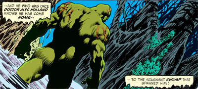 He is keen to get home when he is abducted from these surroundings. (Of course, it is arguably to get back to his research in the hopes of turning human again, but he also seems more comfortable there than he did in the issues charting his journey.) He seeks to restore balance when the gigantic mutated monsters escape into the Bayou. Even after he is apparently murdered by an otherwise innocent alien, the swamp restores him and gives him life again.