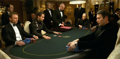 Throughout the film, he’s portrayed as a character who knows the odds and the numbers involved in gambling. At one point, he advises a colleague, “I have two pair, and you have a 17.4 percent chance of making your straight.” And yet, like all addicts, he can’t apply that rational thought to his own gambling. During the tournament, Bond observes that Le Chiffre’s betting is a bit reckless. He spots the villain’s tell during a hand Le Chiffre wins on the last card. “The odds against were 23-to-1, and he’d know that. When he did his first raise he had nothing. Winning was blind luck.”