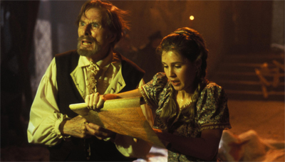 Noonan does Karloff proud in his portrayal of the monosyllabic monster – generating genuine pathos with a minimum of theatrics, an economy of movement. Duncan Regehr, however, struggles a bit portraying Dracula – although the script’s portrayal of the Count feels sadly one-dimensional. Based on his costume and movements, Regehr’s Dracula is very clearly modelled on Bela Lugosi, but the character lacks the faint hint of tragedy that made Lugosi’s performance so classic.