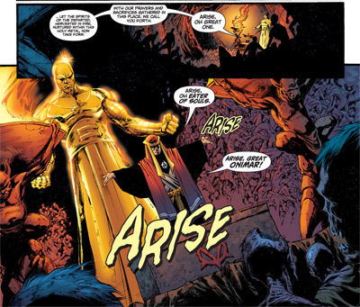 To be fair, Gibbons doesn’t take any of this too seriously, and he’s quite right not to. Just a hint of relevance is enough, after all. An early scene features a deliciously pulpy human (or Thanagarian) sacrifice in which the scream queen victim is fed to a hulking monster in a moment that could easily have been lifted from an old Hammer Horror film. There is something enjoyably pulpy about the notion of the cultish Thangarian religion and “the Seven Devils” that they worship, including the wonderfully (and appropriately named) “Eater of Souls.”