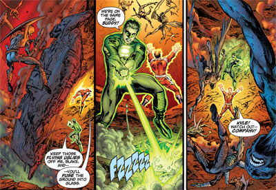 Of course, there’s still room for the failure of institutions that should be heroic, the main theme of Infinite Crisis. Batman, Superman and Wonder Woman have all failed in their own ways, and here the Guardians of Oa are presented as indifferent and impotent galactic police officers. They dispatch Kyle to an intergalactic conflict where thousands of lives hang in the balance, but they give him strict instructions not to interfere. “The Guardians do not want Lanterns involved,”Kilowag advises the human. One wonders why not.
