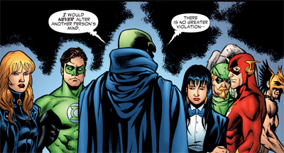 So the notion Brad Meltzer introduced in Identity Crisis – that the Justice League wiped bad guys’ memories to stop them hurting the heroes’ family – can’t be allowed to break the status quo. You can’t resolve the situation by allowing the villains to retain knowledge of the heroes’ secret identities, because that makes the identities redundant and destroys the status quo. At the same time, you can’t kill the villains, because that would remove several useful characters from DC’s continuity.
