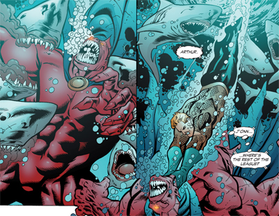 Cleverly, Johns focuses the story around the Martian Manhunter, perhaps the embodiment of the Silver Age. Along with Barry Allen, J’onn J’onz was the character who kicked off the Silver Age at the publisher. Grant Morrison killed the character in the opening issue of Final Crisis to illustrate how far comics had come from the Silver Age. It’s telling that the Martian Manhunter is the last Justice League member to abandon the Watchtower, clinging most rigidly to his Silver Age principles. It’s also interesting that Aquaman, a character frequently derided for his Silver Age “goofy”charm, is the first League member to come to J’onn’s assistance.