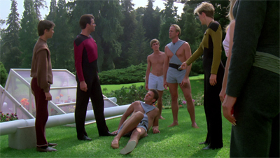 Beverly even states, in the opening scene, “It sounds wonderful for the children.” Nobody bats an eye when Geordi adds that the inhabitants are “neat as pins, ultra-lawful, and make love at the drop of a hat.” I never thought that I’d type this, but the opening scenes of the episode actually use Wesley quite well, as Wheaton does a great job with this incredibly awkward scene where he realises that the fact he under the age of consent is effectively stopping Riker from getting laid. He seems like he’s wondering if his mother will be taking a trip down to this sex paradise as he mutters, “Maybe I should just go on ahead.”