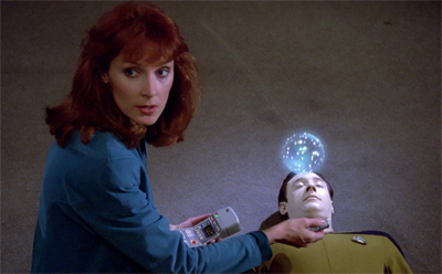 (As an aside, I find it very weird that Yar is more ready to embrace the whole no-barriers aspect of Edo culture far more readily than Troi does. After all, Where No One Has Gone Before confirmed that Yar was still struggling with her back story including perpetual threatened sexual abuse. I get the sense that the writers really had no idea how they wanted to write Yar – no more than Crosby had any idea how she wanted to play her – and that filters down to even the smallest moments of the episodes. I don’t think the character was beyond redemption, but she was certainly the most troubled of the regulars. Compare Crosby’s performances to that of Dorn, with a much smaller and lower profile role in the ensemble. There’s really no comparison.)