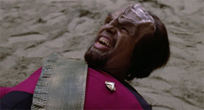 I like the design of the monsters, the surreal image of the Napoleonic uniforms (even when Picard’s not there, Q is still fixated on him) and even that nice shot where Data is revealed to really be Q. We get a nice moment of Worf declining Q’s beverage and some nice team stuff on the planet surface, with Worf prowling and Geordi scouting. All of this makes about as much sense as an episode of the third season of the original Star Trek, but it manages to avoid being actively offensive or insulting.