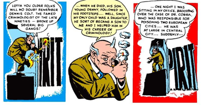 Most interesting, perhaps, is the fact that the Spirit’s origin seems to have been retroactively affected by what was going on in Europe. Dr. Cobra isn’t just a mad scientist, he’s explicitly linked to mass-murder overseas. “I’ve killed over ten thousand people in Europe with my death water!”he boasts. Eisner doesn’t clarify whether Dr. Cobra was working as a terrorist or in some official capacity – some sort of prelude to the destruction to come – but it’s hard to read that line in light of the end of the Second World War (and the revelations that the end of the war about the Holocaust) without shuddering just a bit. It seems like the war was such a profound influence on Eisner that it reached backwards to impact the hero’s origin.