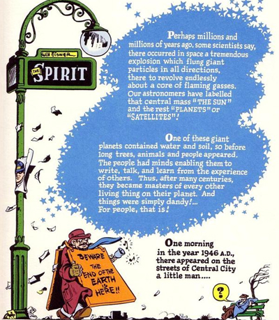 In seven wonderful pages, Eisner hits upon some fascinating ideas. He seems relatively understanding about the destructive capacity of man – suggesting that the atom bomb is just the extension of an ancient concept. The End of the World traces this concept back to the very discovery of fire. As the world goes up, another world across the cosmos is discovering how to burn wood. “Zogk has just discovered the secret of making fire! The medicine men say that it will enable us to rule supreme over all the other animals on our Earth! They are now deciding whether to share the secret with the other tribes in our valley or keep it until we can work out a lasting peace.”