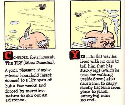 The strip even ends with a nice mindbending epilogue as a person reads the same strip we are reading and have just read (to the point where this character is featured in the bottom three panels of his out newspaper). It’s more than a clever nod towards the audience though, it’s a suggestion that perhaps fiction allows us to explore these possibilities and ideas and high concepts in a way that isn’t threatening. The End of the Worldexploits the newspaper strip concept to allow Eisner to destroy the world without destroying the world.
