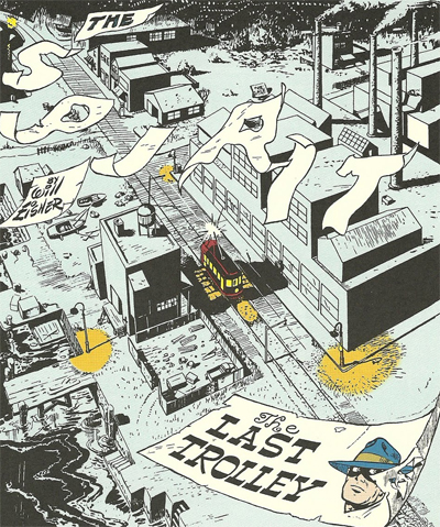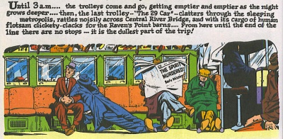 The other best strips in the collection focus on the world outside the Spirit, reflecting Eisner’s admittedly increased awareness of the world outside himself. The Fly tells the strangely tragic tale of Guthrie Bendbagel, trying to deliver a package when the addressee has disappeared. He wanders in and out of a conventional Spirit narrative – interrupting Dolan and the Spirit in their separate inquiries. Like the fly swatted for landing on Dolan’s head, Bendbagel winds up trapped in something bigger than he is aware of. The Last Trolleyis essentially, Crauley’s story. A long and atmospheric train ride with ghosts and skeletons, in which the character’s shady deed come back to haunt him.