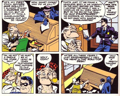 Interestingly, the date 1918 also recurs through the volume. The significance of the year is not lost on Eisner – “The War Ends” reads a note in Dolan’s old desk in The Head in the Desk. Eisner establishes that Dolan’s career began around then – with his “first pinch” in 1918. It’s a neat way for Eisner to establish the generational gap between Dolan and the Spirit. If the Spirit is shaped and informed by the Second World War, then Dolan was influenced by the First World War. It all comes around. Indeed, Dolan’s Origin of the Spirit emphasises that Dolan was something of a father-figure to Denny Colt, and Eisner’s work on The Spirit seems to fixate on generational divide and gap.