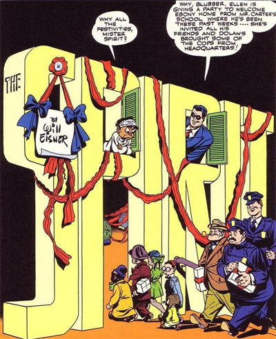 All of this represents progress and evolution in the racial politics of The Spirit, but it’s handicapped somewhat by Eisner’s steadfast refusal to revise and update Ebony himself. It seems, to Eisner, that changing Ebony would be an admission of culpability and a confession of guilt. Despite the fact other black characters are no longer illustrated with those offensive exaggerated characteristics, Ebony’s appearance doesn’t change. As Ever Orange ends with Ebony going to school “t’ git ejakated so’s ah c’n speak wif a No’thern drawl!” However, when he returns inWelcome Home, Ebony!, he still speaks in the same “fonetik” manner, and shows no sign of any increased intelligence or awareness.