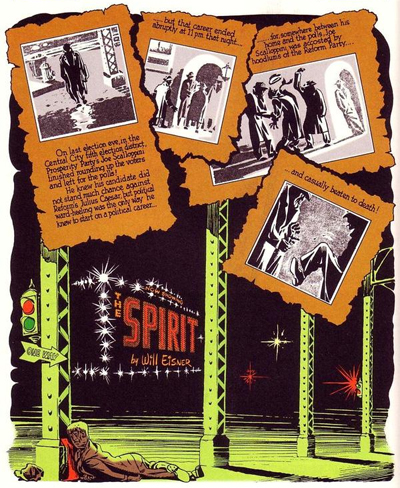 So it seems like quite a surprise when many of the opening pages of this volume are laid out like conventional comic strip pages. Most of the time the logo panel is noticeably larger than those around it, to catch the eye of the reader, but it still feels rather consciously hemmed in. It seems like the stories collected here are so densely and richly packed with story that Eisner found himself forced to use the title page as part of that story, rather than using it to tease or entice the reader. Even some of the more stylish opening pages (Mad Moes, for example) are careful to densely pack the information and back story.