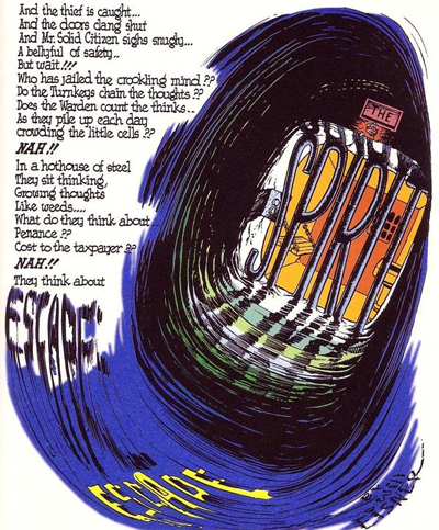 However, despite the innovation of No Spirit Story Today, most of the stories collected here simply work because they strike a nice balance between the elements of the comic that work. The first story, Perfect Crime, is effectively a superbly executed noir short story. Having pulled off the eponymous offense, the criminal Baxter is slowly driven insane by his irrational the fear of the Spirit, suggesting that he could never be secure in the wealth that he has improperly acquired. In a delightfully ironic twist, he dies due his fear of the Spirit – but the Spirit himself remains blissfully unaware. This leaves Dolan to comment, obliviously, “O, well, you can’t catch ’em all the time!!” Similarly, Escape is a series of short stories about a bunch of prison escapees who find themselves trapped in increasingly ironic ways.