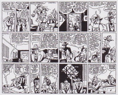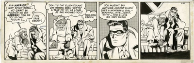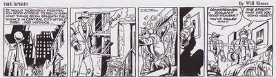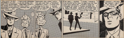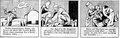 On the other hand, the change in format also brings potential benefits. For one thing, it allows for longer form stories featuring the character, with somewhat tighter continuity between them. While Eisner’s weekly strip would occasionally acknowledge a shared history between characters, each episode was relatively stand-alone and accessible. The daily strip features several storylines, but they generally segue into one another relatively easily. While each story is quite distinct, you can discern a clear bridging section. It would be a bit of an exaggeration to describe it as “seamless”, but it does give the stories a relatively fluid feeling.