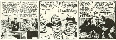 It’s strange, reading all these stories close together, but Dolan doesn’t really come out of them especially well. Despite the fact that the strip opens with the Spirit campaigning to prove Dolan’s innocence, the Commissioner is quick enough to turn on the Spirit when he’s accused of a crime – which would be fine if he were consistent about it, or if it were the first time that it happened. After the Spirit is accused of murder, he advises his daughter, “Don’t cry for him, Ellen! The Spirit met the fate he deserved!” He even gives his men the order to “shoot first and ask questions afterward!” Again, this would be less noticeable if the Spirit hadn’t been repeatedly set up in these stories.