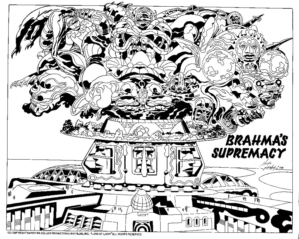 Anyway, in celebrating the success of Argo, how about a look at Jack Kirby’s original designs for the fictitious movie Lord of Light (which became Argo)? Kirby was a comic book legend, who created The Fantastic Four, The X-Men, Captain America, Thor and countless other iconic comic characters. In the seventies, Kirby had an ever heavier science-fiction bint, creating his wonderful Fourth World and The Eternals and O.M.A.C. As part of the operation to rescue the escaped diplomats, Kirby designed these storyboards for the movie, which actually hit upon several of the author and artist’s favourite themes – including advanced god-like beings and the merging of the rational with the mystical.