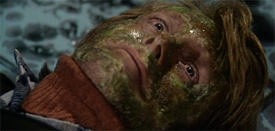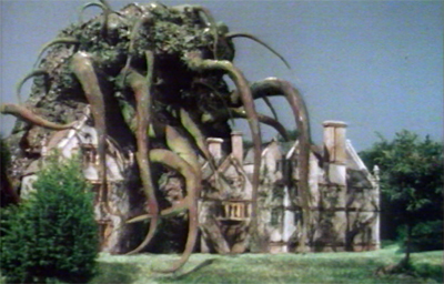 In fairness to the adventure, most of the special effects are pretty impressive. Yes, the wandering Krynoid in its early stages is very clearly just a guy in a silly suit, but the initial pod special effects look great, as do the initial stages of transformation (I especially like the fact that even Keeler’s bald spot goes green). While the tentacles are fairly standard issue for the series, and one can detect the CSO, there are some marvellous shots of the monster attacking the mansion, and the sequences with the attacking plant life outside (including Scorby’s ultimate fate) are a lot more effective than an attack of “aggressive rhubarb” should be. As I noted above, Hinchcliffe had a wonderful skill for keeping the series within its means, and mostly avoiding more awkward special effects failures.