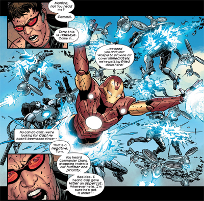 Indeed, you could almost read Divided We Fall as a hyper-compressed tribute to Mark Millar’s twenty-seven issue run. It’s very clear that Humphries considers Millar a major influence, perhaps most obvious in his characterisation of Tony Stark. Millar’s Stark is one of the aspects that arguably dates The Ultimates, making pop culture references that are already a little stale. Humphries continues that tradition of namedropping celebrities who will probably have faded from the spotlight in another decade. “How do you feel?” Jarvis asks. “Tougher than Jay-Z and prettier than Beyonce,” Stark responds. It’s an exchange that Millar could have written.