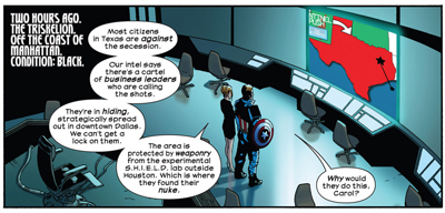 Of course, all of this is really secondary to the big selling point of Divided We Fall, the much publicised decision to make Captain America the Commander and Chief of this version of America. The notion of a superhero President is absolutely absurd (“America is my White House”), but absurd in a fun way. There’s an undeniably hokey charm about watching the President of the United States kick all kinds of ass, like a superhero twenty-first century version of Teddy Roosevelt.