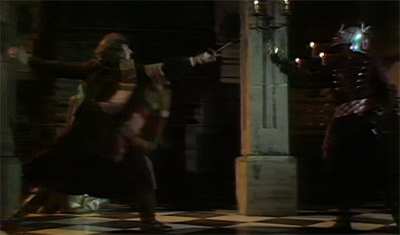 Though the setting allows the show to look relatively impressive while staying within its relatively tiny budget, I’d be remiss if I didn’t point out some of the cheesier moments. None of them ruin the serial, which is all in good fun, but I found something hilarious about android!Romana shooting killer lasers from her tummy! “Rather ingenious, don’t you think?” Count Grendel asks, and I’ll concede it’s certainly unconventional. Then there’s the rather obvious android!king who gets impaled with a spear, when there must have been more convincing ways to do that shot rather than swapping the actor out with a dummy.