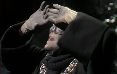 Ah, the Shadow. Again, part of me imagines there’s a context where the Shadow might work as a villain. Kind of like I’ll argue that Adric worked as a companion in Warriors’ Gate, I’m sure that there’s some adventure out there which really needs a serious dose of the melodramatic capital-VILLAINY villainy of the Shadow. Sadly, a serial that opened with a satirical look at propaganda watched in a triage centre during a devastating war is probably not the place for a character like this.