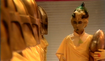 The science of the story, although couched in terms like “tachyon” and with reference to quantum physics, doesn’t especially impress me. It’s more the fascinating work that Fisher does with the Argolans, and the way that he portrays a society on a planet that “won’t be habitable for three-hundred years”, in the wake of a war that only took twenty minutes. There’s a sense of finality about it, particularly when the Doctor remarks that the Leisure Hive itself is “an Argolan farewell gesture”, a tomb where the dead just happen to be walking around. It really does create a sense of a society on the verge of complete collapse, and the atmosphere is heavy throughout – helped by elements like the prematurely-aged Doctor and the sense that the predators are already circling the corpse.