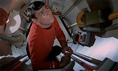 The Naked Time acknowledges that space is full of the unknown and the unknown is inherently scary. Returning from the mission, Spock states, matter-of-factly, “It could be some form of space madness we’ve never heard of, but it would have to be caused by something. Our spectro-readings showed no contamination, no unusual elements present.” Scott astutely responds, “Or at least none your tricorders could register.” Spock concedes the point. “Instruments register only those things they’re designed to register. Space still contains infinite unknowns.” And the unknown is inherently scary, a reflexive response to the threats that stalked our ancestors in the darkness.