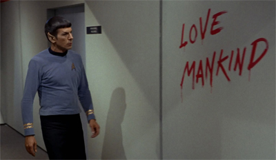 In Where No Man Has Gone Before, the classic Star Trek embraced the sixties fascination with pseudo-science quite readily – with the concept of “ESPer” humans never really touched on again. Indeed, the show seemed quite rational and fairly logical from that point out. However, The Naked Time engages more directly with a more social form of sixties counter-culture. “LOVE MANKIND,” Spock reads on a bulkhead at one point. You’d be hard-pressed to find another image better expressing the flirtation between Star Trek and counter-culture.