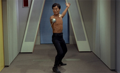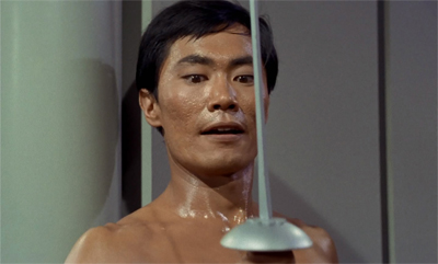 It’s worth noting that Sulu’s sword-related hobby is fencing. One of the small complaints I had with the reimagined 2009 Star Trek movie was the fact that the film gave Sulu a samurai sword. Having the Asian cast member using a samurai sword seems a bit cliché, and it’s a shame that The Naked Time actually seems more progressive than a film released four decades later. Indeed, in his introduction to the VHS edition of the episode, Takei notes that the choice of weapon is small, but significant: