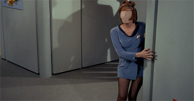 The only thing funnier is imagining Patrick Stewart in the same position, but that would require a situation where a anybody might assume that inappropriate physical contact would be a good idea within the mostly sterile confines of The Next Generation. It’s a gag that could only really work with the strange gender politics of the original Star Trek and the charm of William Shatner playing Kirk confronting those.