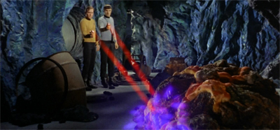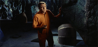Kirk then falls back on the idea that it is stupid to risk the two highest ranking officers on the ship. It’s an argument that he must know is baloney, even before Spock shreds it with those handy statistics Coon liked to give the science officer. After all, Kirk and Spock tend to do all manner of crazy stuff together. If this wasn’t an issue in A Taste of Armageddon, why is it coming up now? The obvious answer is that Kirk doesn’t want Spock doing anything crazy like trying to capture the creature alive – both for Spock’s own safety and the safety of everybody else in the caves.