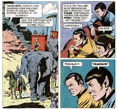 So a wacky story involving insane dictators and giant elephants and time-traveling time bombs probably isn’t going to hold up too well. And No Time Like the Past is rife with problems and plot holes. We join the story as Kirk is hunting down the “deposed dictator, Trengur, who escaped from an insane asylum” on Oorego IV. Despite the fact that this is the first we’ve heard of him, Kirk seems to know him quite well, asserting, “I know… Trengur is a megalomaniac… he can’t stand to be ruled by any man!” It’s hardly a massive logical leap (megalomaniacs tend to have authority issues), but it seems weird that Kirk asserts it with such confidence.