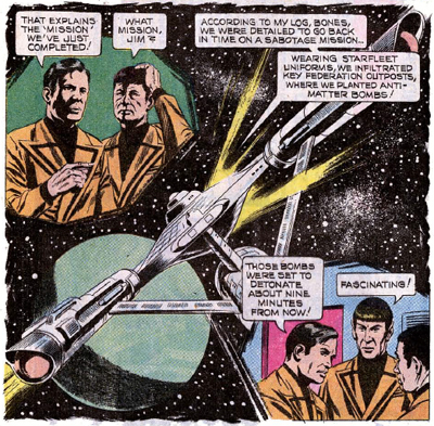 But don’t worry, there’s no time to process all that. There’s more coming! “That explains the ‘mission’ we’ve just completed!” Kirk remarks. Bones walks into it, “What mission, Jim?” Kirk remarks, “According to my logs, bones, we were detailed to go back in time on a sabotage mission… wearing Starfleet uniforms, we infiltrated key Federation outposts, where we planted anti-matter bombs! Those bombs were set to detonate about nine minutes from now!” Spock even gets to add a “fascinating!”