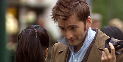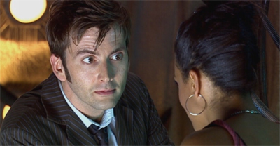 Interestingly, this seems to overtly hint at a romantic relationship, stopping just short of romantically confirming it. I have no real problem with that, save it diminishes some of the innate alien-ness of the Doctor, and “alien-ness” is one of the defining traits of Tennant’s Doctor. However, that moment feels significant. And I don’t mind the mention at the end of Smith & Jones. Unfortunately, Rose keeps coming up throughout the season, to the point where both Martha and I roll our eyes when her name is mentioned in Utopia.